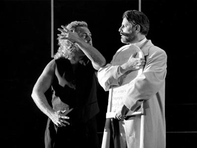 Erstmals kommt »Moses und Aron« auf die Leipziger Opernbühne, inszeniert von dem berühmten 8ojährigen Theatermann George Tabori. Nach dem Gastspiel des Burgtheaters Wien mit »Berichte für eine Akademie« nach Franz Kafka im vergangenen Jahr steht mit »Moses und Aron« zum zweiten Mal eine Produktion von Tabori auf dem Programm der euro-scene Leipzig.