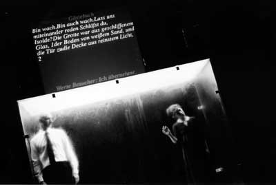 »Ausstellungsstück« hat Fabian doppeldeutig seine Inszenierung genannt. Der Zuschauer ist nicht in ein Theaterstück geladen, sondern in eine Ausstellung. Nicht die Handlung von Wagners Oper wird erzählt, sondern der Vorlage, dem Tristan-Epos, das Gottfried von Straßburg um 1210 hinterlassen hat, die Essenz abgerungen. Tristan begehrt Isolde, die Frau des Herrschers, aber sie können ihre Liebe – ständig unter Beobachtung des Hofes – weder zeigen noch leben. Fabian sagt zu seiner Arbeit: »Mein Ziel ist nicht die Aufführung der Handlung wie in einem Theater, sondern die Ausstellung der Liebenden und damit des ordnungs- und gesetzesüberschreitenden menschlichen Gefühls als ein zu bewahrender Anspruch an die Gesellschaft. Ich stelle Tristan und Isolde in einer Glasvitrine aus: Vision und Fluch einer unsterblichen Liebe sollten in ihr gleichermaßen konserviert erscheinen« (Konzeptionsmaterial vom 15.05.2001).