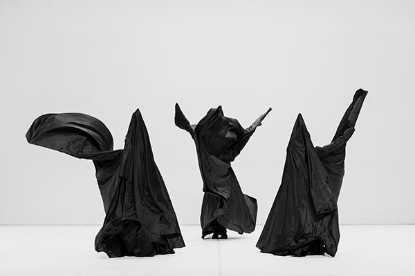 In »Bombyx mori« werden diese Parameter weiterentwickelt: Drei Tänzer vervielfachen die minimalistische Synthese aus Körper, Material und Klang, das Geräusch des Stoffes spielt eine Hauptrolle. Drei schwarze »Serpentinen-Schmetterlinge« von Loïe Fuller sind aus den Larven geschlüpft und in verwandelter Form zurückgekehrt. Das Stück war bisher in Paris, Brüssel und Wien zu sehen.