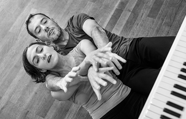 Ein Mann und eine Frau treten in einen ausdrucksstarken Dialog, tanzen vor, neben und auf dem Flügel, und spielen Klavier, während sie tanzen. Sie erzählen auf abstrakte Weise ein enges künstlerisches und menschliches Miteinander – die Harmonie als Sehnsuchtsort scheint hier für Momente Realität zu werden.