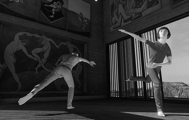 Die Ebenen verschwimmen miteinander: Die Wüste erstreckt sich plötzlich in eine Stadtlandschaft oder in eine Hütte auf dem Gipfel eines Berges. Ausgestattet mit VR-Brillen bewegt sich das Publikum frei im realen Raum und interagiert mit den Tänzern der virtuellen Welt. So wird Tanz neu und anders erlebbar. Zum ersten Mal verbindet ein Choreograf Tanz mit Virtual-Reality-Technologie.