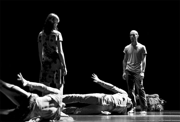 Immer wieder durchqueren 14 Tänzerinnen und Tänzer die Bühne, unermüdlich, ununterbrochen, unendlich. Am Anfang kriechend wie die Urtiere, erheben sie sich langsam, sie gehen, laufen, fallen, stehen auf, laufen, bleiben stehen und beginnen wieder von vorn, gefangen im Kreislauf der Dinge und in der Sehnsucht nach Weiterkommen.