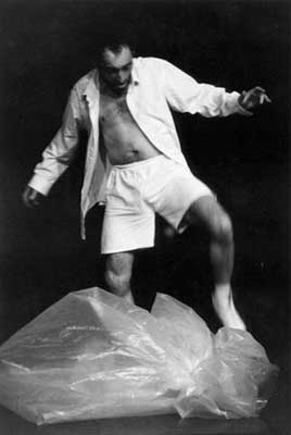 The plastic wrapping hides a human body. An odd-looking light ignites under this artificial skin and in turn is suddenly stabbed by a knife. Eerie sounds accompany the act of liberation from the embrace. Men group into comical clusters and then break apart. Presentation switches to music and in turn the sound create is strange, scenic movements.